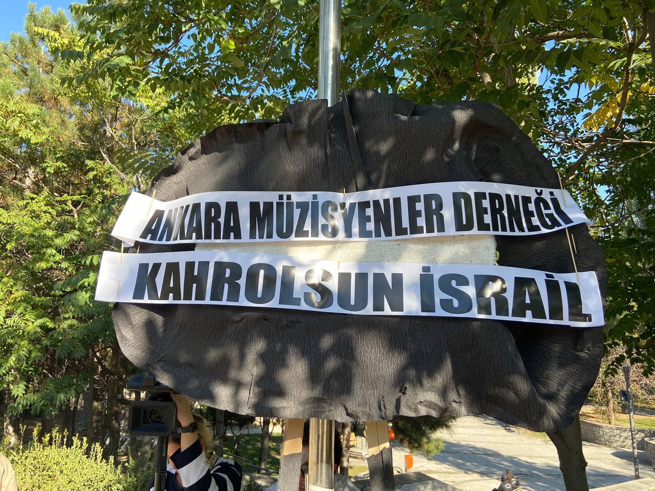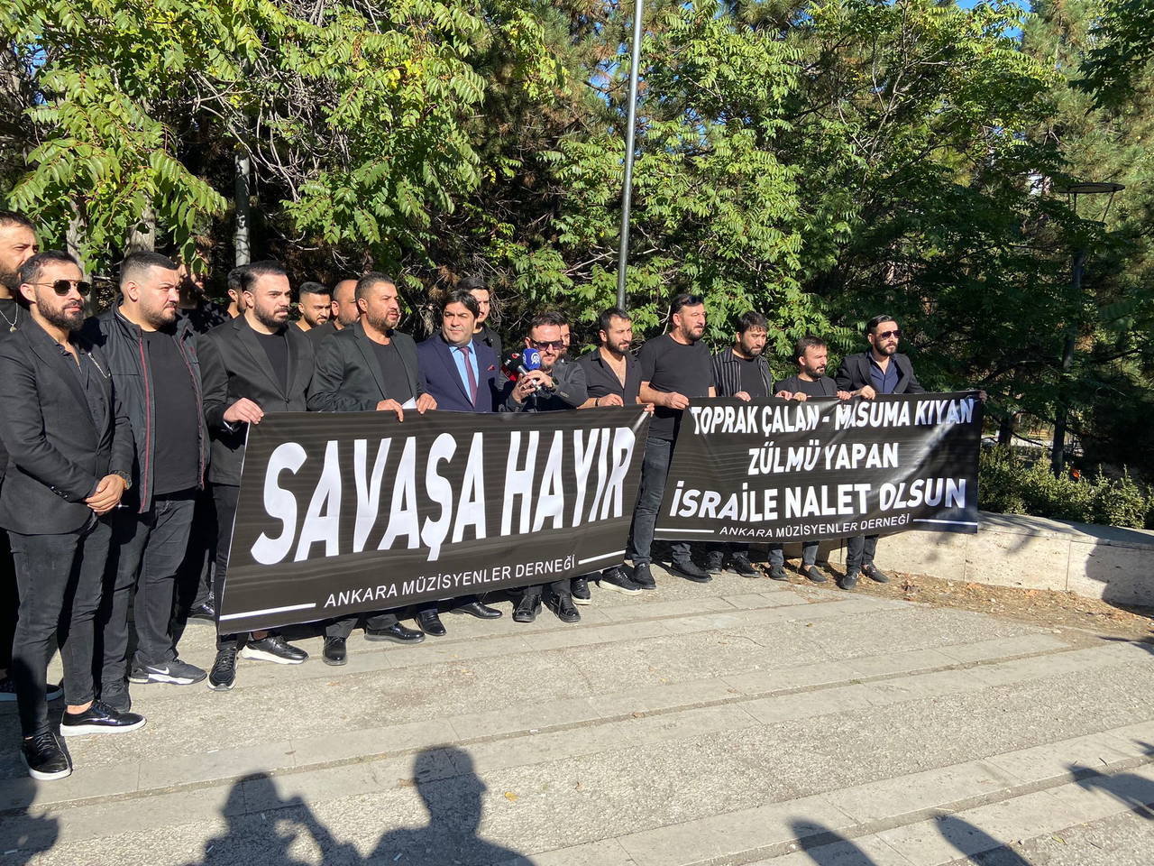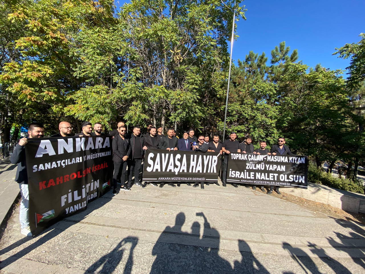 Ankaralı Müzisyenler Derneği'nden bir grup müzisyen, İsrail Büyükelçiliği Konutu önünde toplanarak 'Savaşa hayır' ve 'Toprak çalan, masuma kıyan, zulüm yapan İsrail'e lanet olsun' yazılı siyah pankartlar açtı.