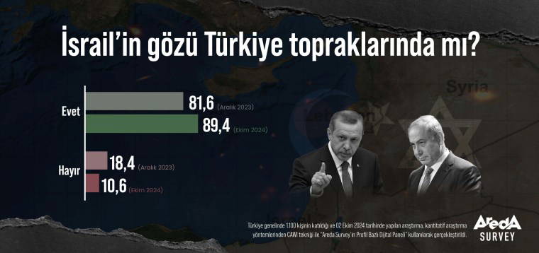 Şirket, 2 Ekim 2024 tarihinde yaptığı yeni anketi kamuoyu ile paylaştı. Buna göre, İsrail'in gözünün Türkiye topraklarında olduğunu düşünenlerin sayısı yüzde 89,4'e yükseldi.