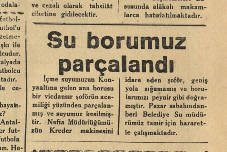 1960’lara kadar Kale’deki İskele Kaynağı’ndan Saka adı verilen su satıcılarının katırlar üzerine yükleyip sattığı suyu içen Antalya halkı, nihayet 1955 yılında Hurma’dan bağlan şebeke ile evindeki musluktan içme suyuna kavuşuyor. Hurma’yı daha sonra Gürkavak takip ediyor. Bu tarihten sonra kent halkı için şebeke suyunun taşıdığı önemi, sergideki bir gazete kupüründe “Zalim Kamyoncu Antalya’yı Susuz Bıraktı” başlığındaki haberle, Konyaaltı’na bir kamyon şoförünün bir su borusunun üzerinden geçmesi ile şehrin susuz kaldığında gösterdiği tepkiden okunabiliyor.