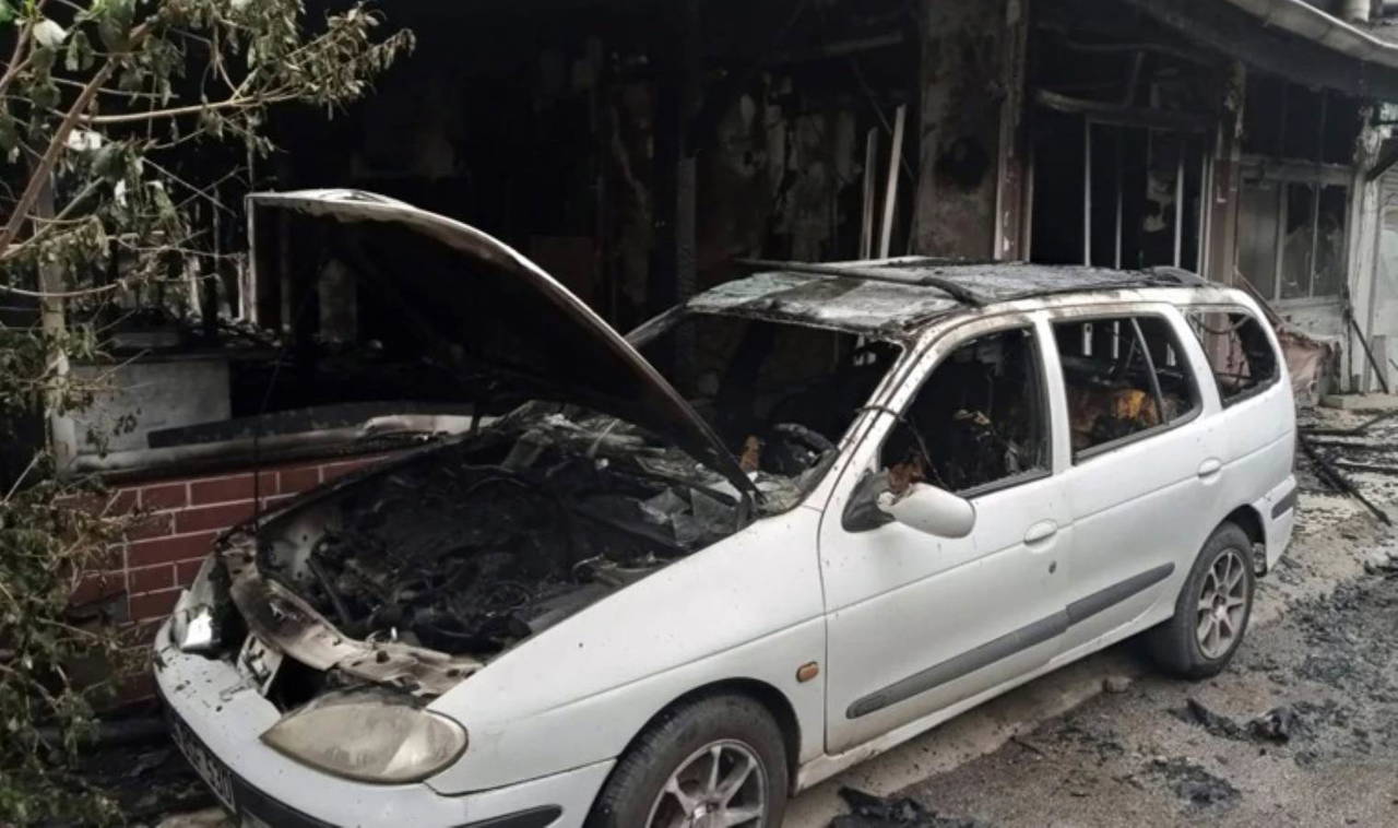 İtfaiye ekiplerinin müdahalesiyle bitişiğindeki binalara sıçramadan söndürülen yangında, iki katlı bina ile park halindeki otomobil kullanılamaz hale geldi.
