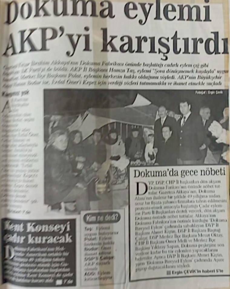 Dokuma Fabrikası arazisinde çadır kurarak eylemi başlatan gazeteci İbrahim Akkaya o günlerde yaşadıklarını şu sözlerle anlatıyor: