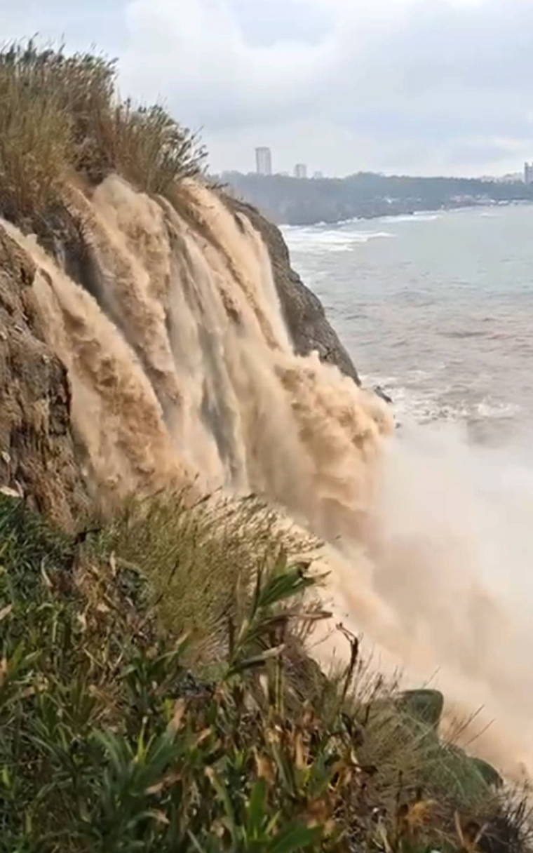 Sağanak sonrası, şiddetli akan Düden Şelalesi'nin rengi de kahverengiye döndü. Muratpaşa ilçesi Lara bölgesinden denize dökülen şelalede, tersten gelen rüzgar şelale sularını deniz yerine karaya savurdu. Şelalenin denizle buluştuğu noktaya gelenler, çamur gibi akan suyu görünce şaşkınlık yaşadı. Çamurlu su deniz üzerinde de kahverengi tabaka oluşturdu.