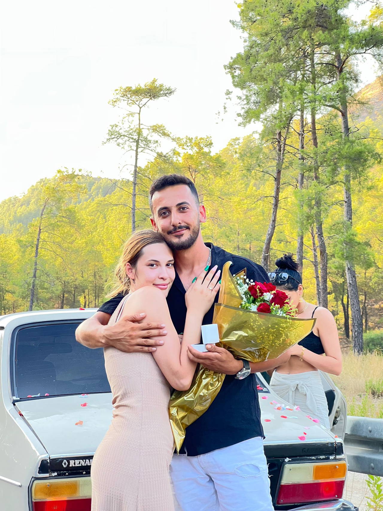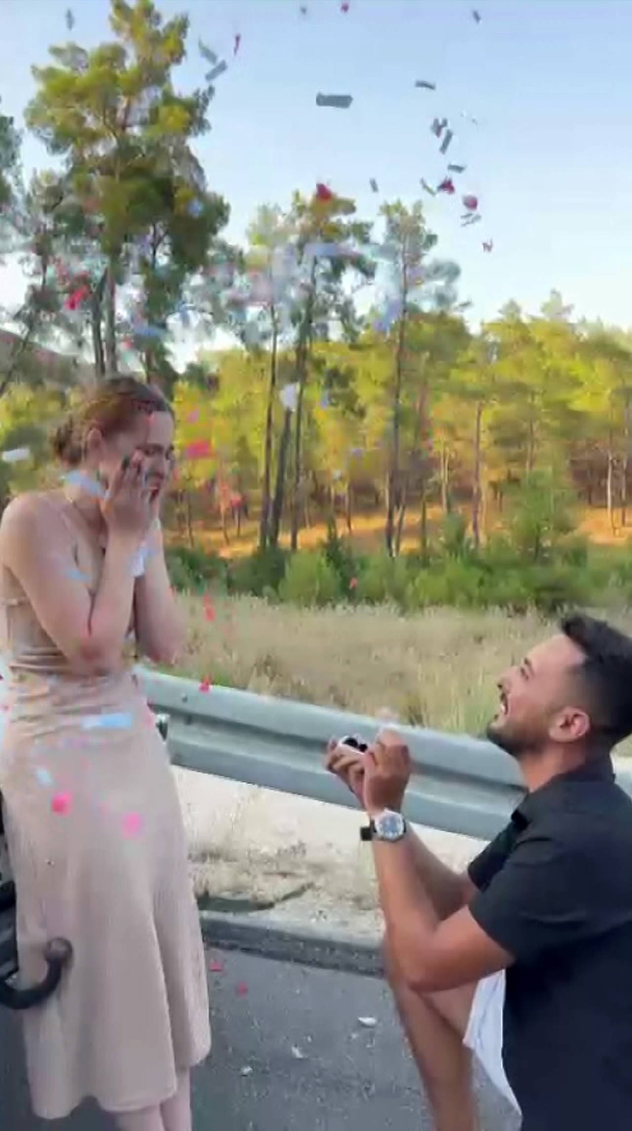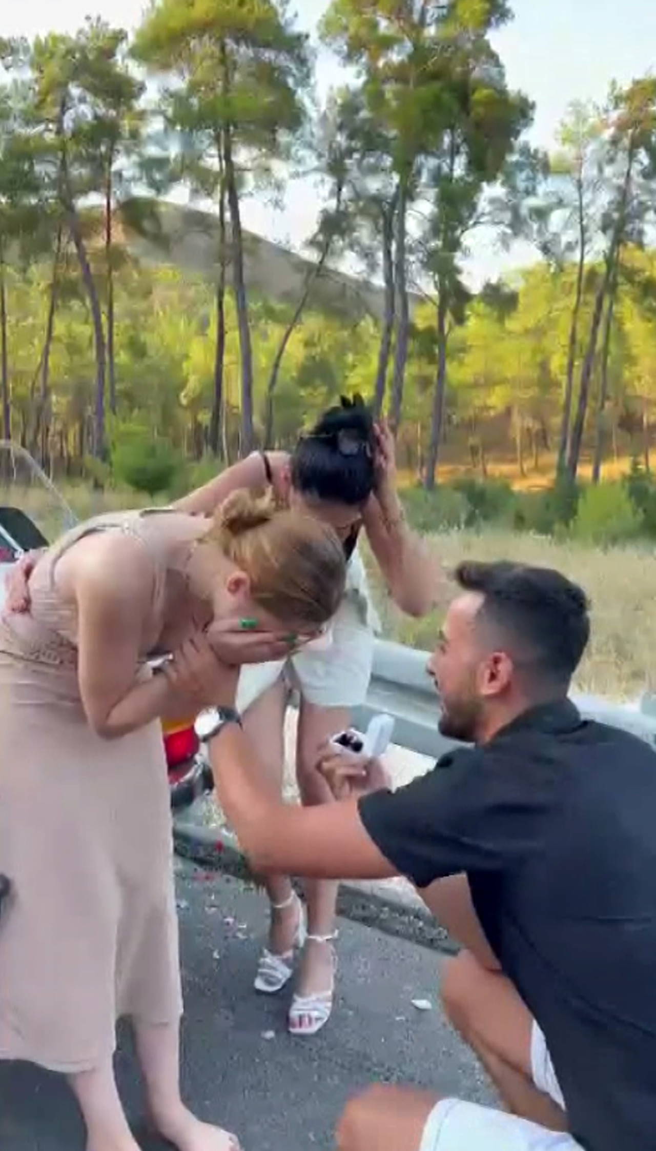 Farklı bir araçla gelen çiftin arkadaşları çiçekler getirip konfeti patlatırken, yerden kalkan Orhan Alpaslan da cebinden yüzük çıkarıp, diz çöktü, "Ecem bir bak. Soluma yaslanıp, ömür boyu benimle evlenir misin?" dedi.