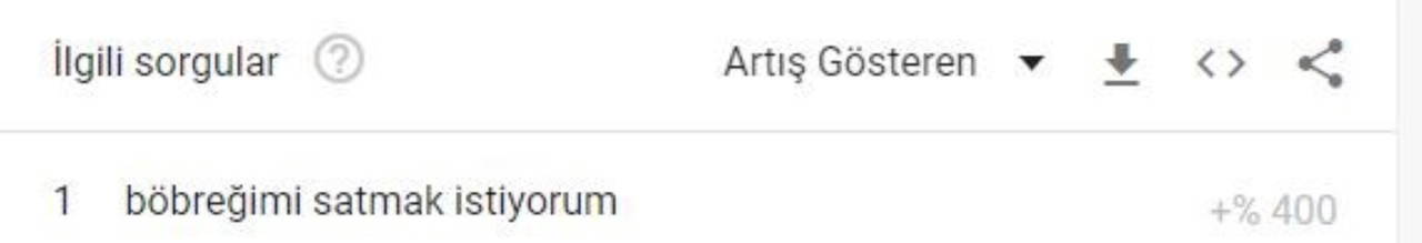 BirGün'den Mustafa Kömüş'ün haberine göre, trendlere göre ‘böbreğimi satmak istiyorum’ ifadesini aratanların oranı son bir yıl içinde tam yüzde 400 arttı. Bu ifadenin en çok üç büyük kentte aratılması ise dikkat çekti. "Böbreğimi satmak istiyorum" ifadesi en çok İzmir’de aratılırken onu İstanbul ve Ankara takip etti.