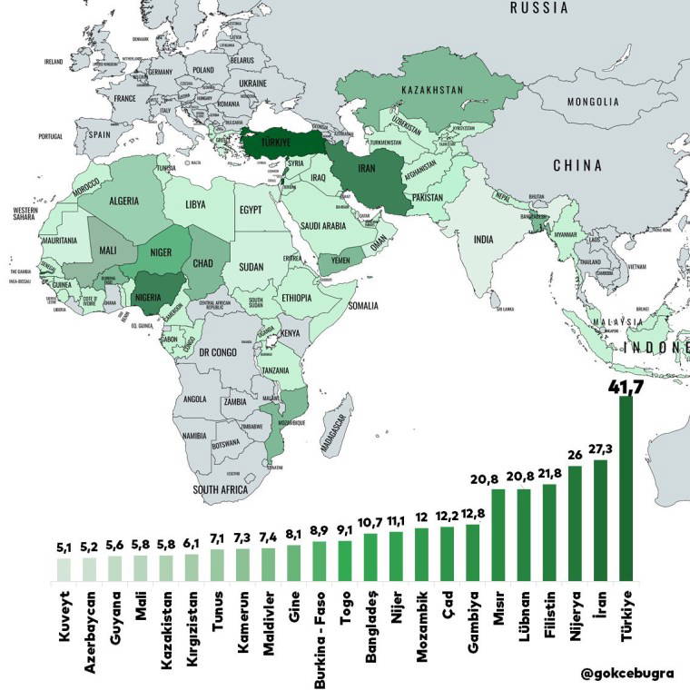 "İslam İşbirliği Teşkilatı'na (İİT) üye 57 ülke arasında gıda enflasyonunun en yüksek olduğu ülke Türkiye. İslam İşbirliği Teşkilatı üyesi 57 ülkenin 8'inde çatışma koşulları veya yerel sorunlar nedeniyle gıda enflasyonu güncel verileri bulunamazken, kalan 49 ülkede ortalama gıda enflasyonu 6,7. Türkiye hariç ortalama gıda enflasyonu ise sadece 6.