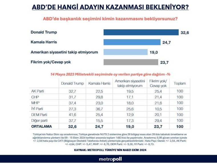 Ankete göre Türkiye seçmeni; yüzde 32,6 ile ABD'de Donald Trump'ın seçimi kazanmasını beklediklerini belirtti. Trump'ın rakibi Harris'in oranı ise yüzde 24,7 oldu.