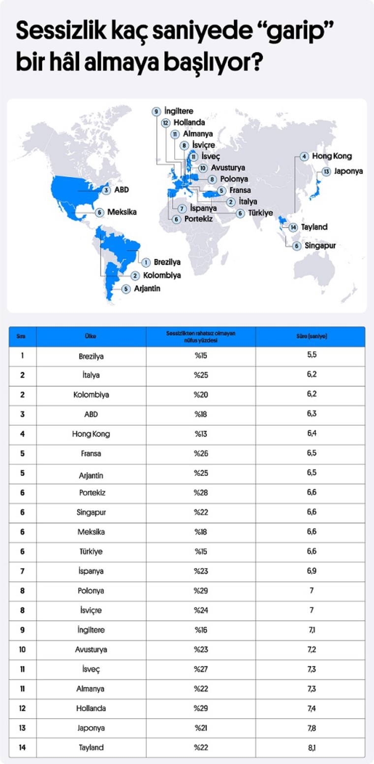 İngilizce özel ders platformu Preply’nin Türkiye'nin de dahil olduğu 21 ülkede 26 bin 719 katılımcıyla gerçekleştirdiği araştırma, sessizliklerin dünya çapında ortalama 6,8 saniyeden sonra garipleşmeye başladığını ortaya koydu.