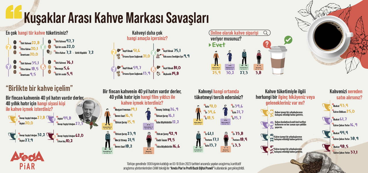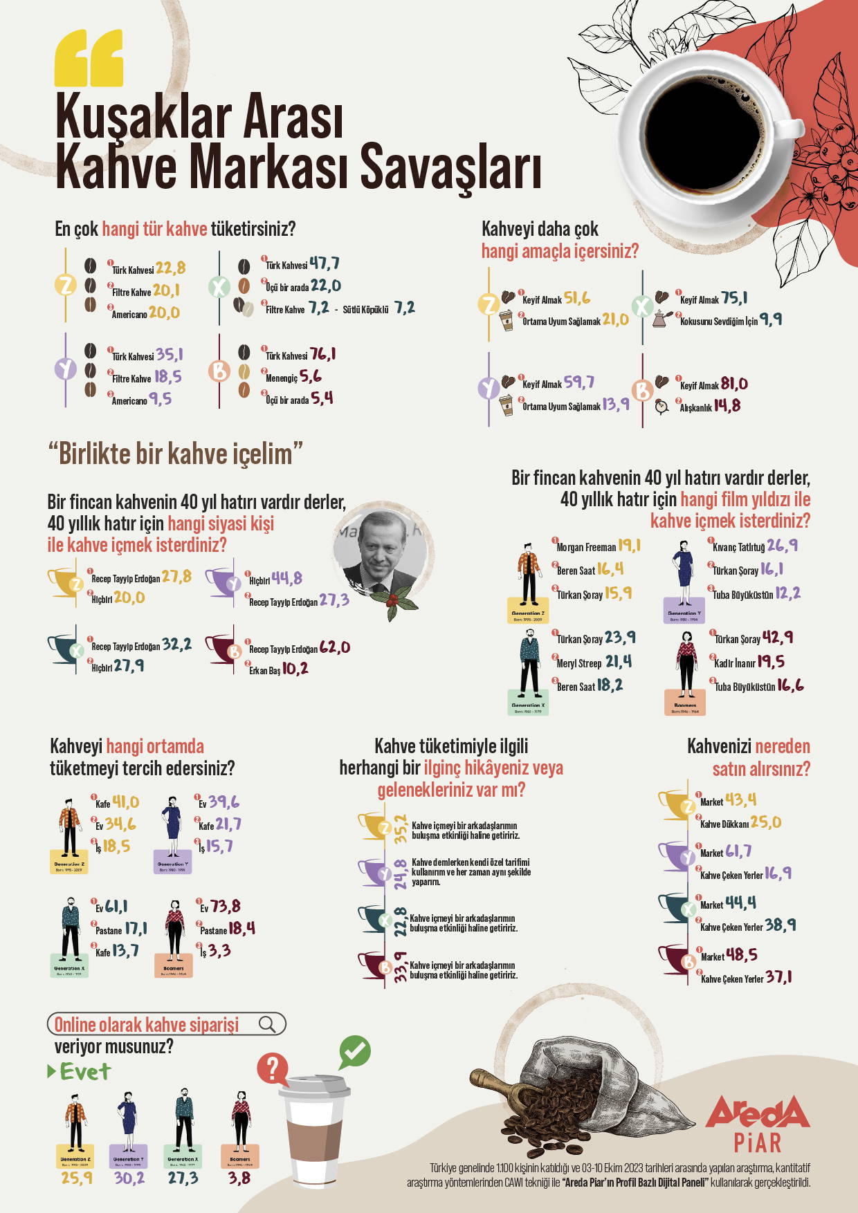 Türk kahvesinden sonra en çok tüketilen kahve türleri filtre kahve, americano, üçü bir arada, sütlü köpüklü ve menengiç olmak üzere kuşaklara göre değişkenlik gösterdi. Birlikte kahve içmek istenilen siyasetçi Recep Tayyip Erdoğan olurken, film yıldızı kategorisinde ise Türkan Şoray yer aldı.