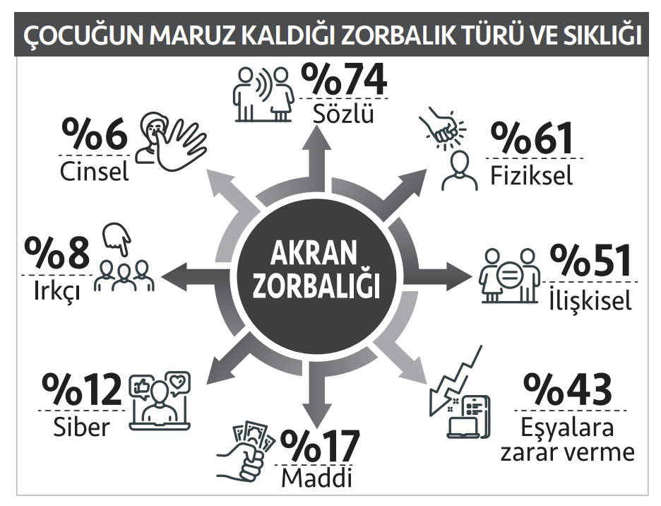Siber zorbalığa da değinilen araştırmada, bireysel zorbalığın siber ortamda kolektif zorbalığa dönüştüğü belirtildi ve akran zorbalığına maruz kalan çocukların akran ilişkilerinde sözlü zorbalık oranının yüzde 74, fiziksel zorbalık oranı yüzde 61, ilişkisel zorbalık oranının ise yüzde 51 düzeyinde görüldüğü kaydedildi.
