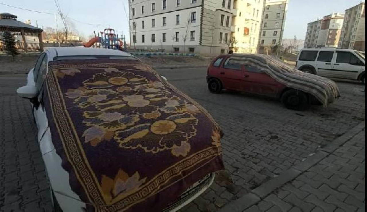 Yurttaşlar, araçlarını soğuktan korumak için battaniye ile önlem aldı.