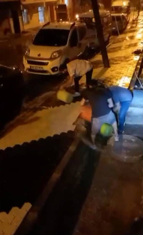 Rögardan taşan suların bodrum katlarını basması üzerine çevredekiler, kovalarla kanaldaki suları tahliye etmeye çalıştı.