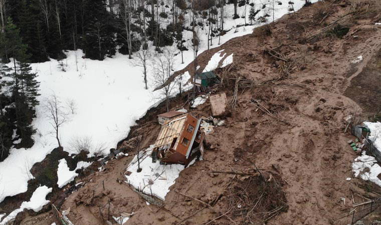 Heyelan sırasında, yapısal bütünlüğünü kaybetmeyen bir ev, altındaki toprağın kayması sonucu önce yan yattı, ardından taklalar atarak devrildi.