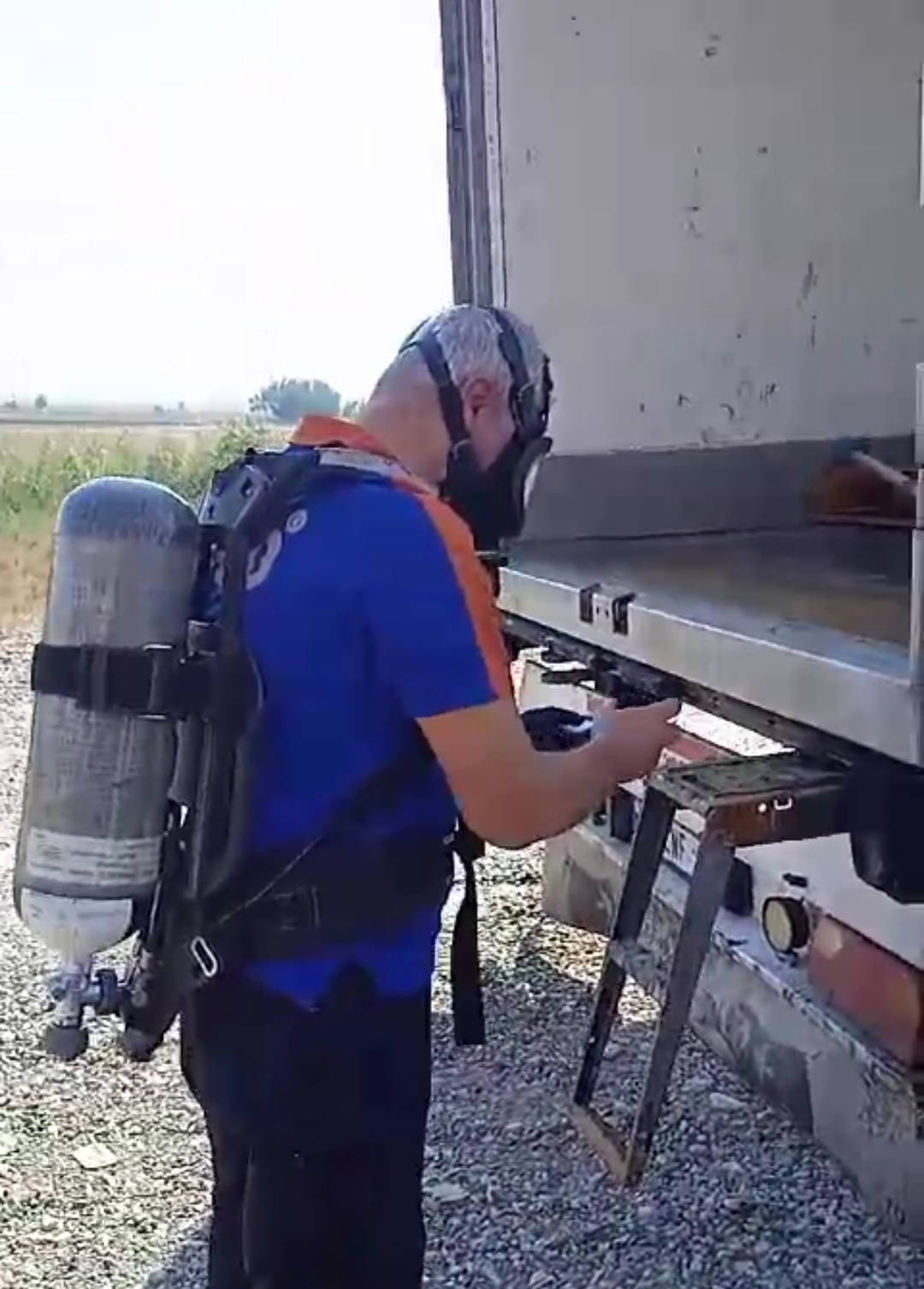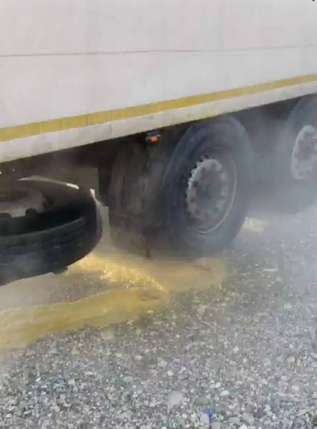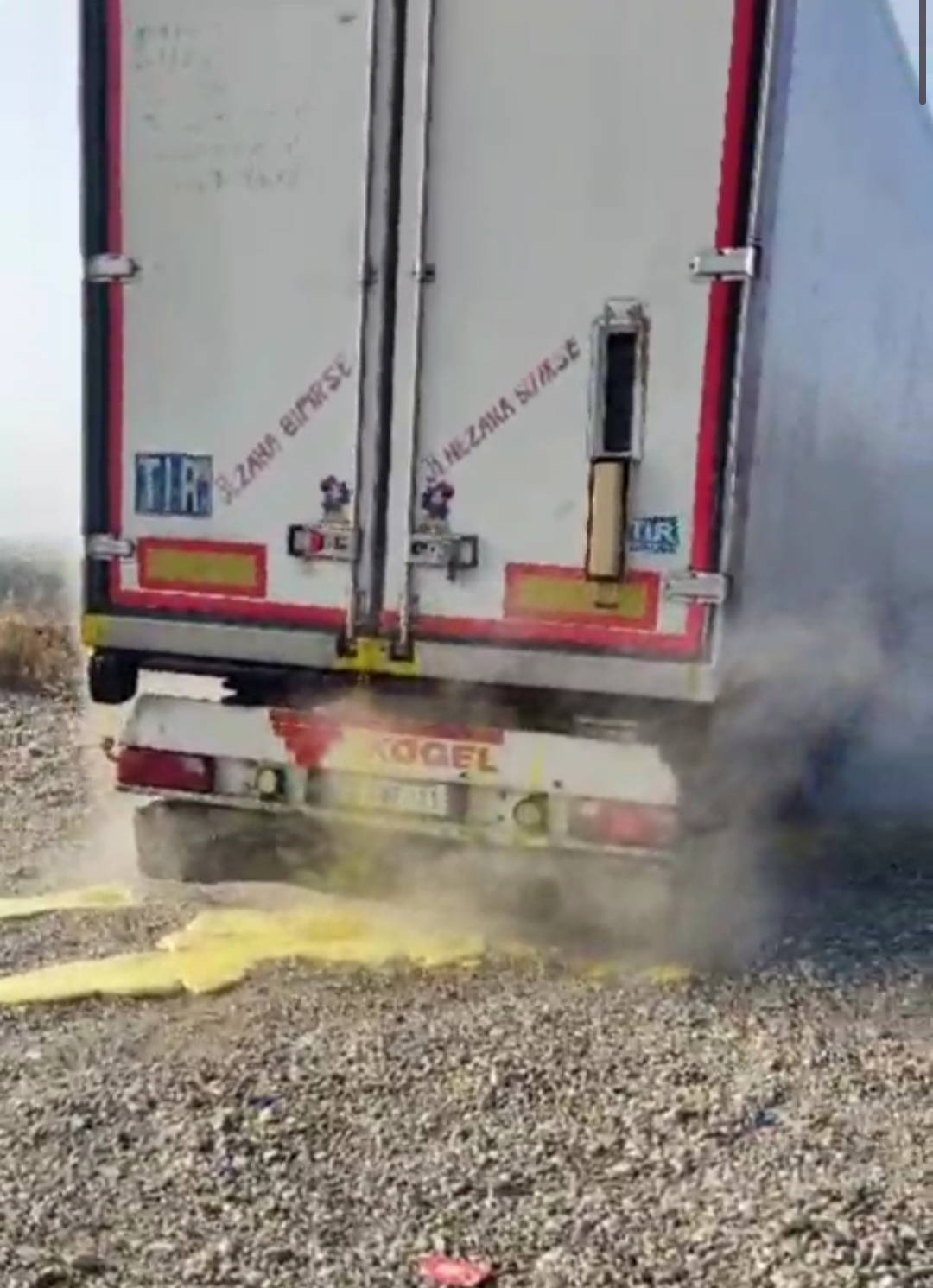 TIR’ın güvenli bölgeye park eden sürücü, durumu 112 Acil Çağrı Merkezi’ne bildirdi.