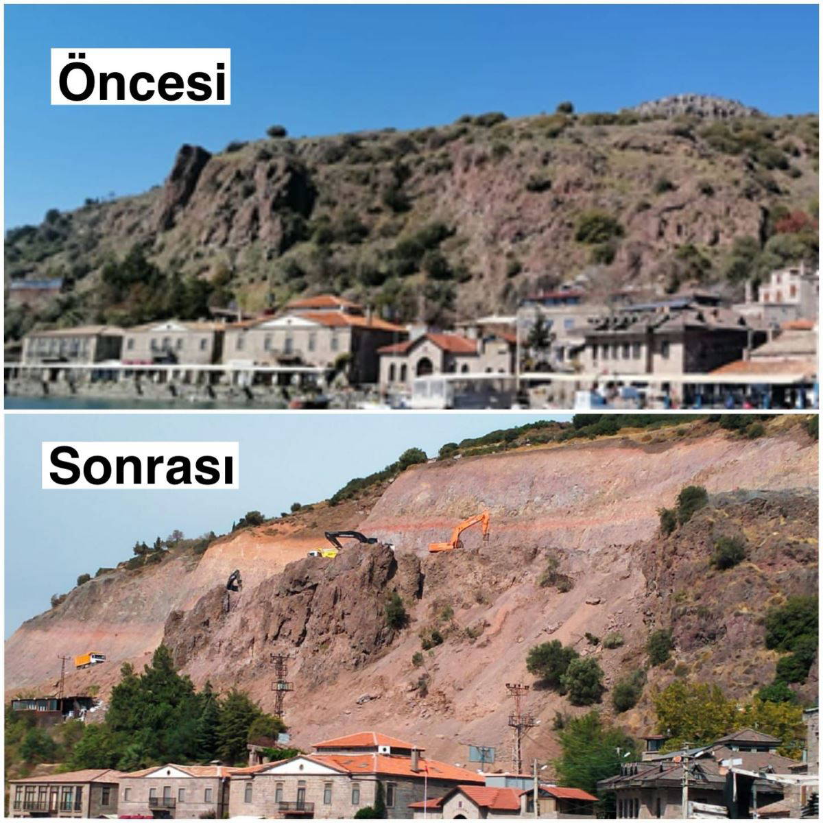 Açıklamanın devamında “Yapılan çalışma gevşek taş ve kayaların kopmasını, yuvarlanmasını önlemenin çok daha ötesinde, yeryüzü şeklini, haritaları değiştirecek ölcekteydi. UNESCO kültür mirasına aday Assos’ta yapılan bu çalışmanın müellifleri kimlerdir bilemiyoruz. Geçmişte Türkiye’de ya da dünyanın başka neresinde 1. derece arkeolojik ve doğal koruma alanında bu tür bur çalışma yapmışlardır? Emanetçisi, güvenliğinden sorumlu olduğumuz bu uygarlık ve doğa mirasını yok eden projenin mimarı kimdir?