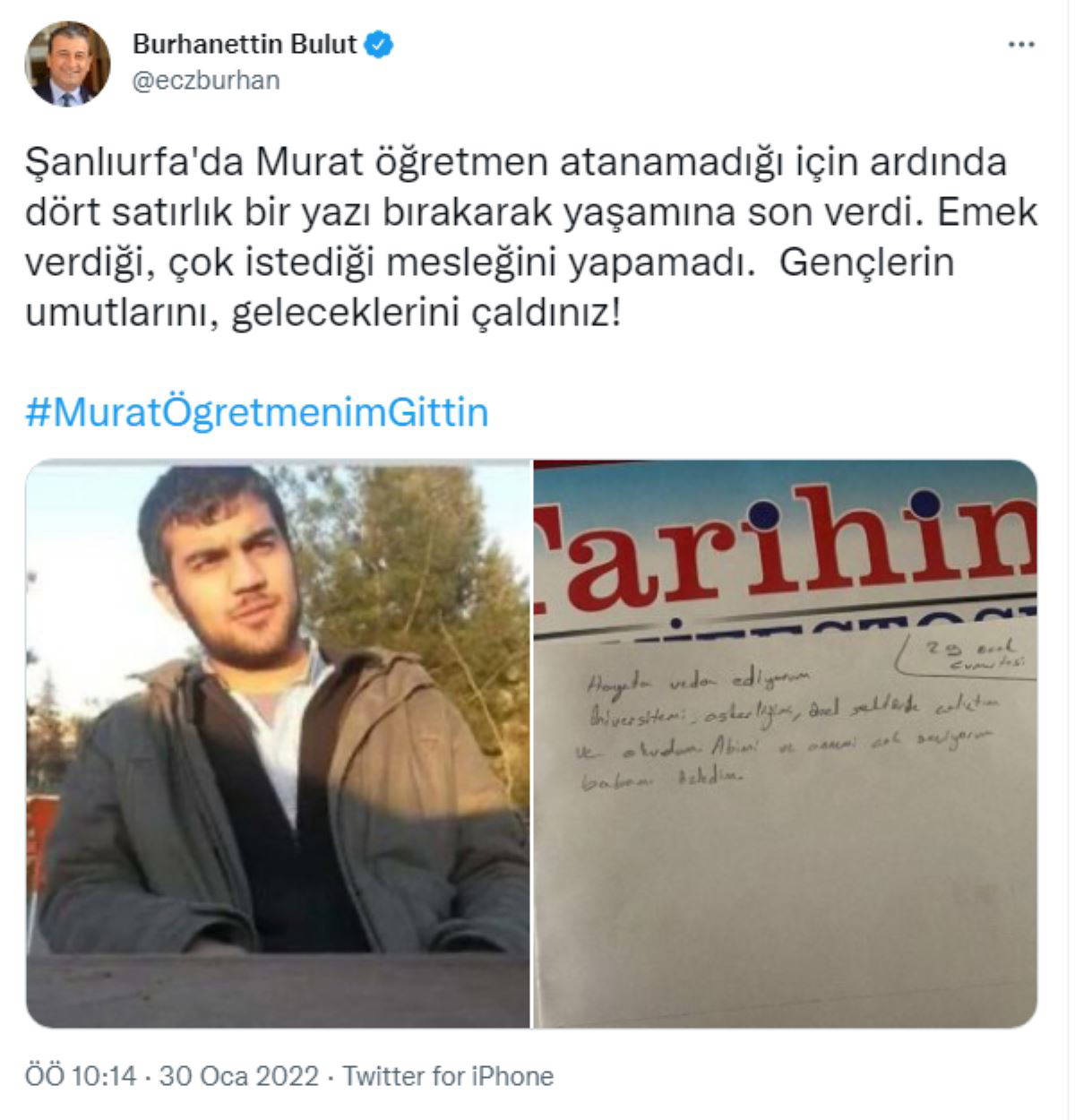 Sosyal medya hesabından paylaşım yapan CHP Adana Milletvekili Burhanettin Bulut ise, ''Şanlıurfa'da Murat öğretmen atanamadığı için ardında dört satırlık bir yazı bırakarak yaşamına son verdi. Emek verdiği, çok istediği mesleğini yapamadı. Gençlerin umutlarını, geleceklerini çaldınız'' diyerek üzüntüsünü dile getirdi.