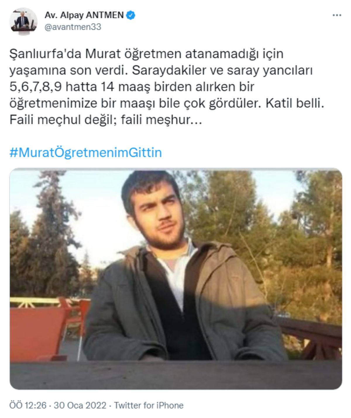 CHP Mersin Milletvekili Alpay Antmen, ''Şanlıurfa'da Murat öğretmen atanamadığı için yaşamına son verdi. Saraydakiler ve saray yancıları 5,6,7,8,9 hatta 14 maaş birden alırken bir öğretmenimize bir maaşı bile çok gördüler. Katil belli. Faili meçhul değil; faili meşhur'' ifadelerine yer verdi.