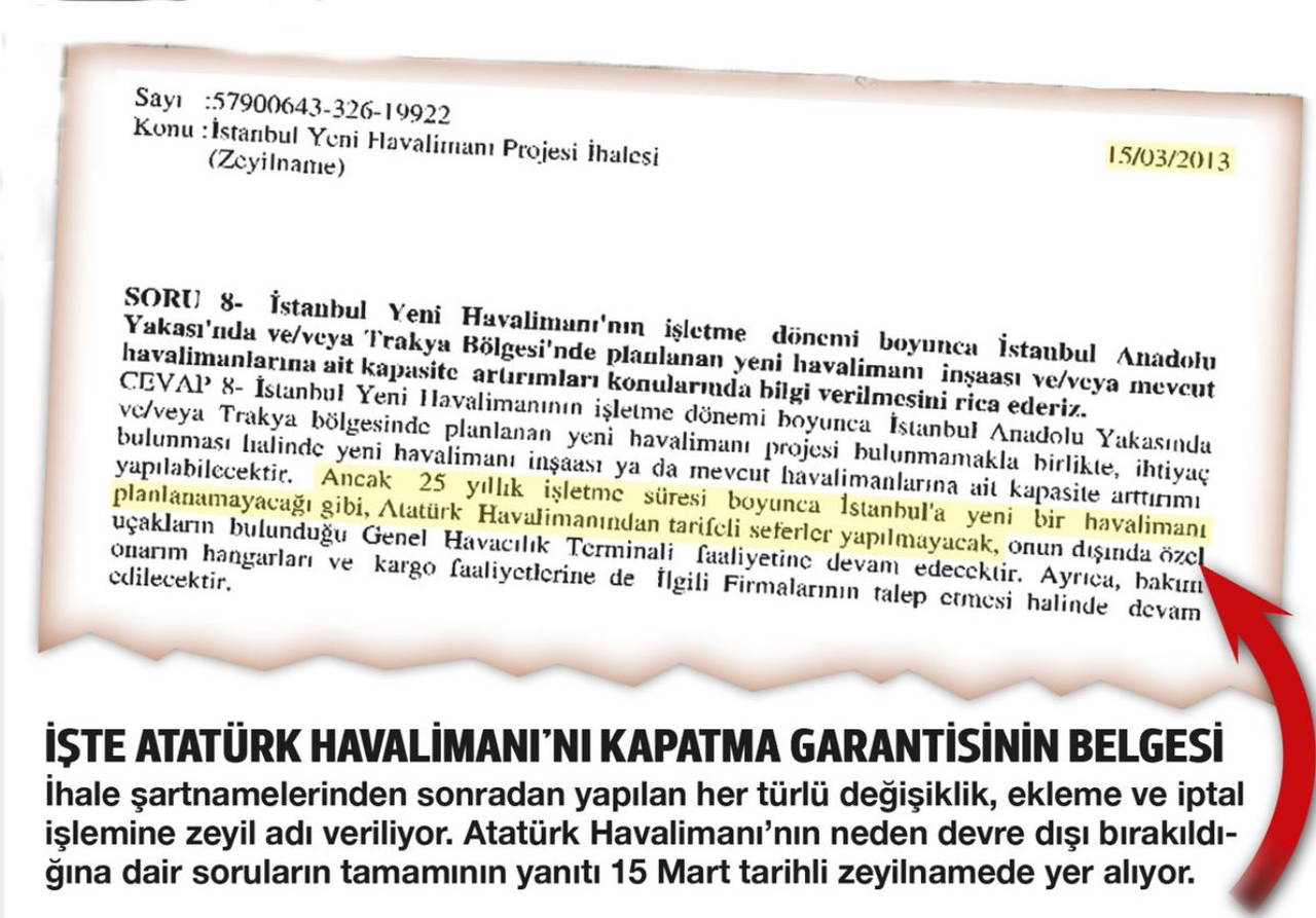 “25 yıllık işletme süresi boyunca İstanbul'a yeni bir havalimanı planlanamayacağı gibi, Atatürk Havalimanı'ndan tarifeli seferler yapılmayacak.”