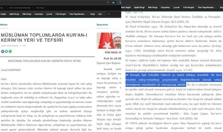 Diyanet'in web sitesinde bulunan dört ayrı makale ve içerikte FETÖ lideri Gülen'e atıf yapıldığı tespit edildi.