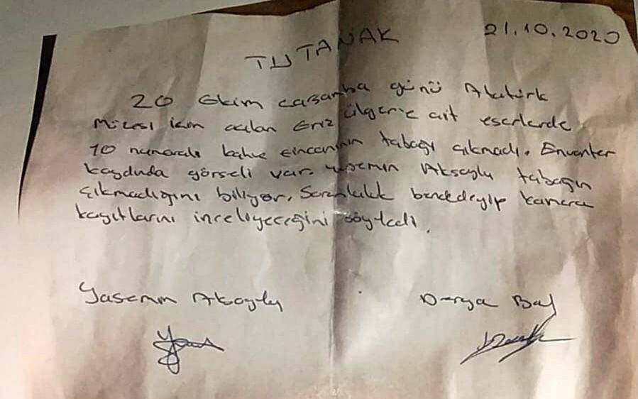 Hemen harekete geçen İzmit Belediyesi yetkilileri, kayıp olayıyla ilgili tutanak tuttu. Tutanakta, "20.10.2020 Salı günü, saat 09.00’da verilen talimat gereği, Hacı Hızır Mahallesi’nde bulunan Atatürk Müzesi’nde, Mustafa Kemal Atatürk’ün sağlığında kullandığı manevi eşyaların bulunduğu 9 adet ahşap sandık açılarak tek tek kilitli cam bölüme konulmuştur. Bu düzenleme esnasında sadece 10 nolu fincan altlığı görülmemiştir" denildi.