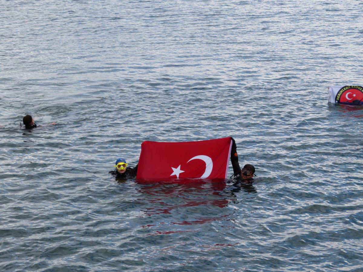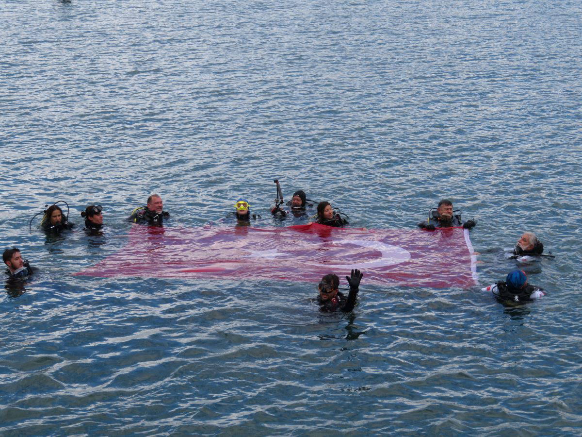 Dalgıçlar daha sonra bayrak ve resimleri deniz yüzeyine çıkardı. Suyun içinde meşaleler yakan dalgıçlar, İzmir Marşı ve 10. Yıl Marşı'nı söyledi.