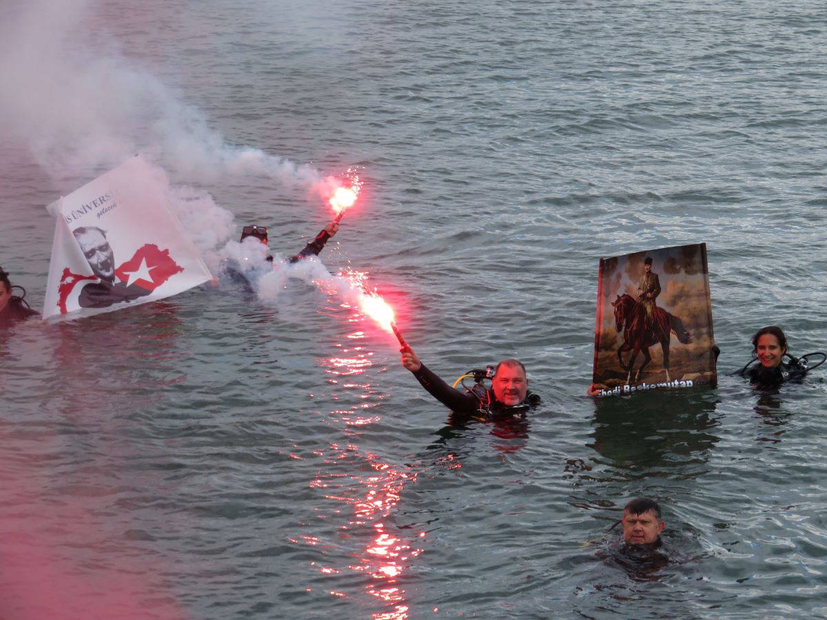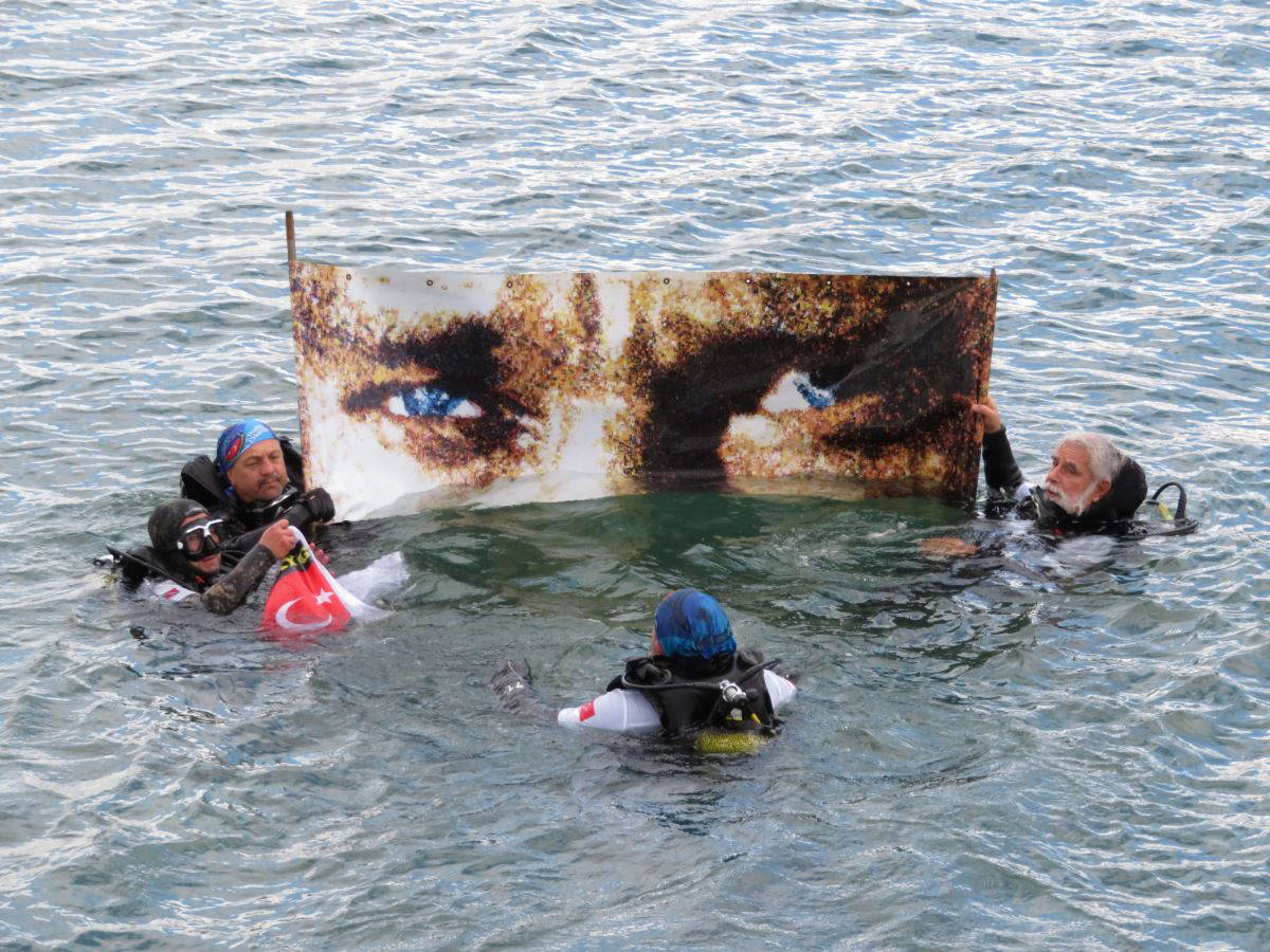 Denize giren 18 dalgıç, İngiliz Ressam Ned Pamphilon'a ait 'At Sırtında Samsun'da adlı tablo ile Atatürk'ün mavi gözlerini ön plana çıkararak çizdiği 'Atatürk'ün Gözleri' tablosunun kopyalandığı resim ve Türk Bayrağı'nı deniz altında açtı.