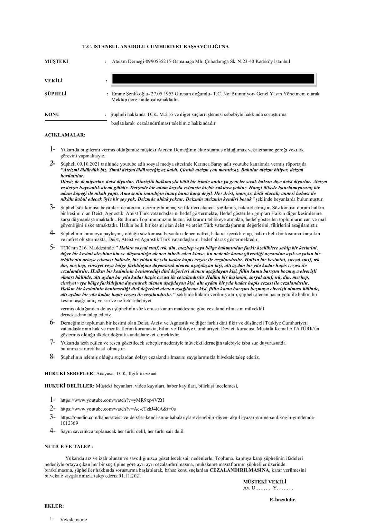 Ateizm Derneği olarak, bunun asla bizzat muhatap olmayacağımız bir seviyesizlik olduğunu belirtmek isteriz. Halkın din, mezhep bakımından farklı özelliklere sahip bir kesimini, diğer bir kesimi aleyhine kin ve düşmanlığa alenen tahrik eden Şenlikoğlu’na karşı bu defa da biz TCK 216’yı göreve çağırıyoruz. Bu tavra karşı vereceğimiz tek cevap, yaptığımız suç duyurusudur.