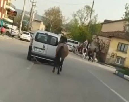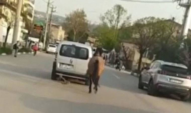 Olay, önceki gün Nilüfer ilçesi Akçalar Mahallesi’nde meydana geldi. Balıkçı Yolu Caddesi’nde atını yularıyla kullandığı hafif ticari araca bağlayıp götüren H.H.B.'in o anları cep telefonu kamerasıyla kaydedildi.