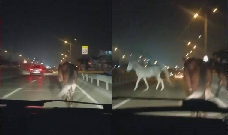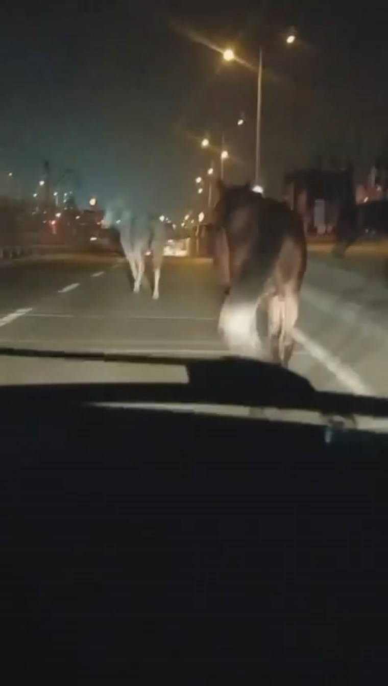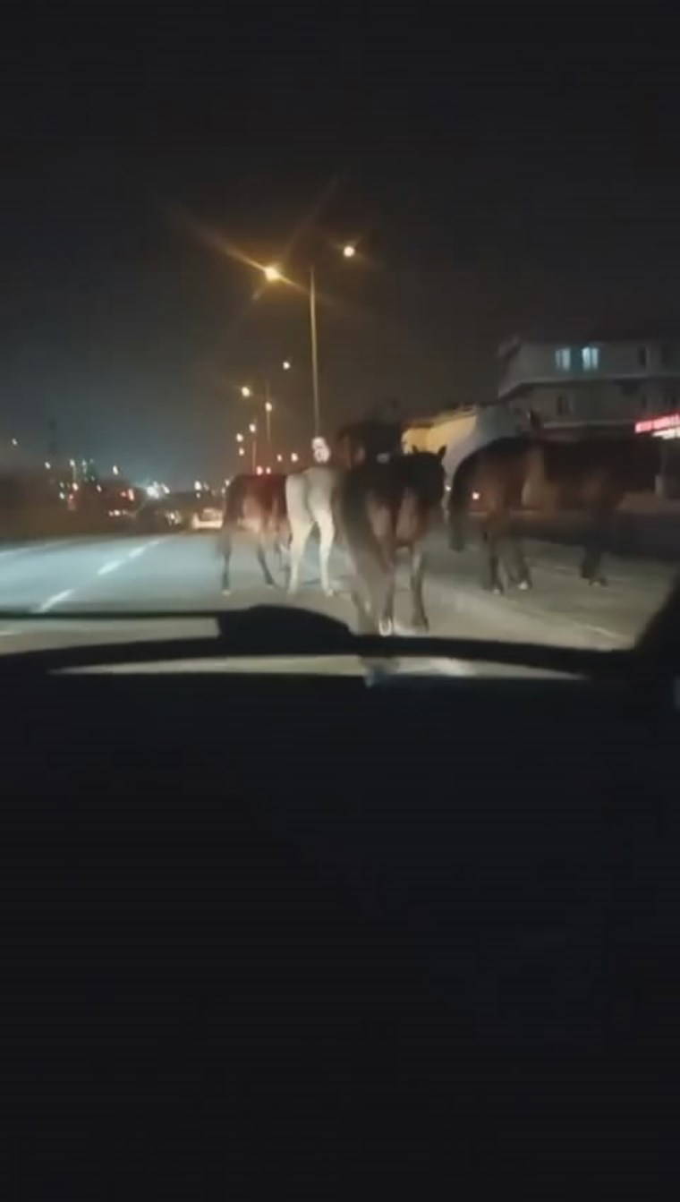 Atları fark eden sürücü, korna basarak atları yoldan çıkarmaya çalıştı. O anlar saniye saniye amatör kameraya yansıdı.