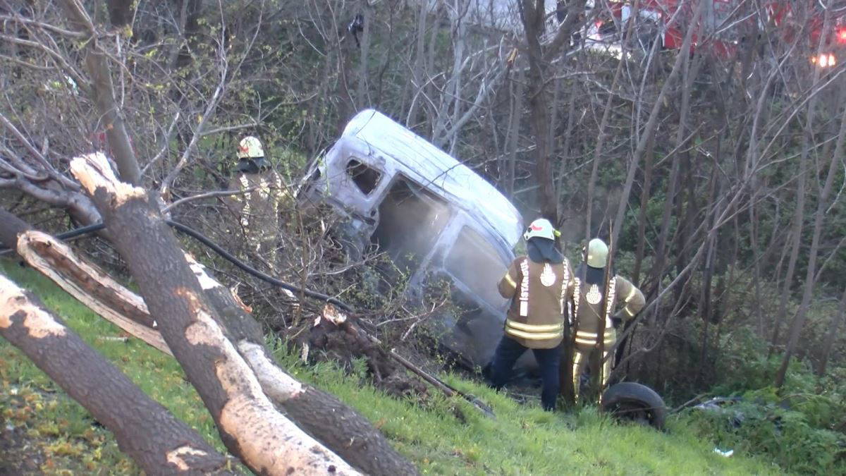 İstanbul'un Avcılar ilçesinde TEM Otoyolu'nda sürücüsünün direksiyon hakimiyetini kaybettiği hafif ticari araç, ağaçlık alana uçtu.