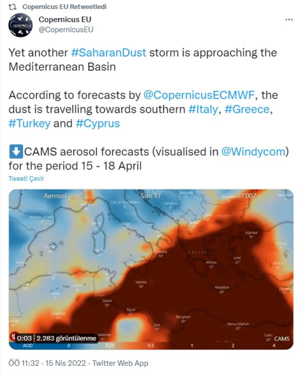 Avrupa Uzay Ajansı'nın yer gözlem sistemi Copernicus'un verilerine göre, Sahra Çölü'nden çıkan toz bulutunun Akdeniz Havzası'nı etkisi altına alması bekleniyor. Çöl tozu fırtınasının Türkiye, İtalya, Yunanistan ve Kıbrıs yönünde hareket edeceği duyurulurken, fırtınanın etkisinin 15-18 Nisan tarihleri arasında hissedileceği kaydedildi.