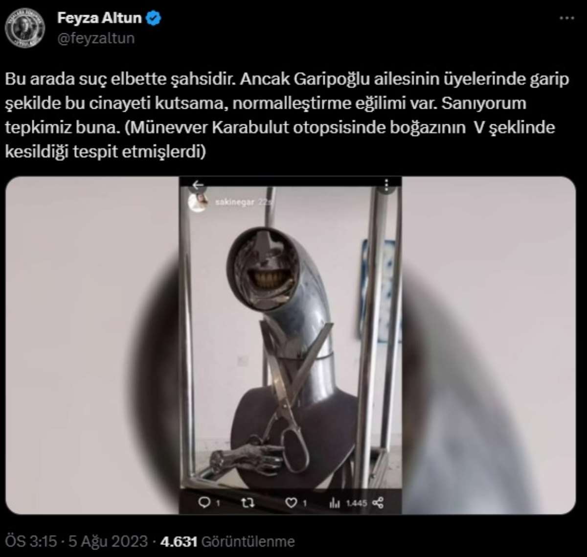 Twitter hesabından bir paylaşım yapan Altun, "Bu arada suç elbette şahsidir. Ancak Garipoğlu ailesinin üyelerinde garip şekilde bu cinayeti kutsama, normalleştirme eğilimi var. Sanıyorum tepkimiz buna. (Münevver Karabulut otopsisinde boğazının V şeklinde kesildiği tespit etmişlerdi)" ifadelerini kullandı.