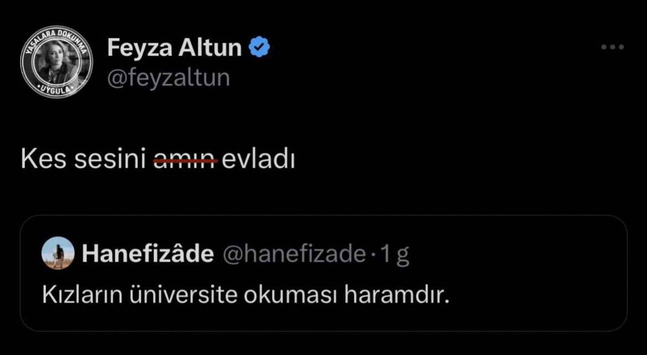 Feminist avukat ve yazar Feyza Altun, sosyal medyada kadınların üniversite okumalarının haram olduğunu söyleyen kullanıcıya tepki gösterdi.