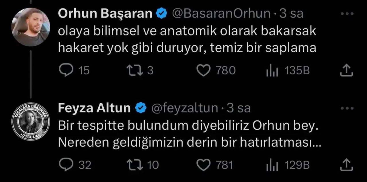 “Olaya bilimsel ve anatomik olarak bakarsak hakaret yok gibi duruyor, temiz bir saplama” şeklinde yorum yapan bir takipçisine yanıt veren Altun, “Bir tespitte bulundum diyebiliriz Orhun bey. Nereden geldiğimizin derin bir hatırlatması…” dedi.