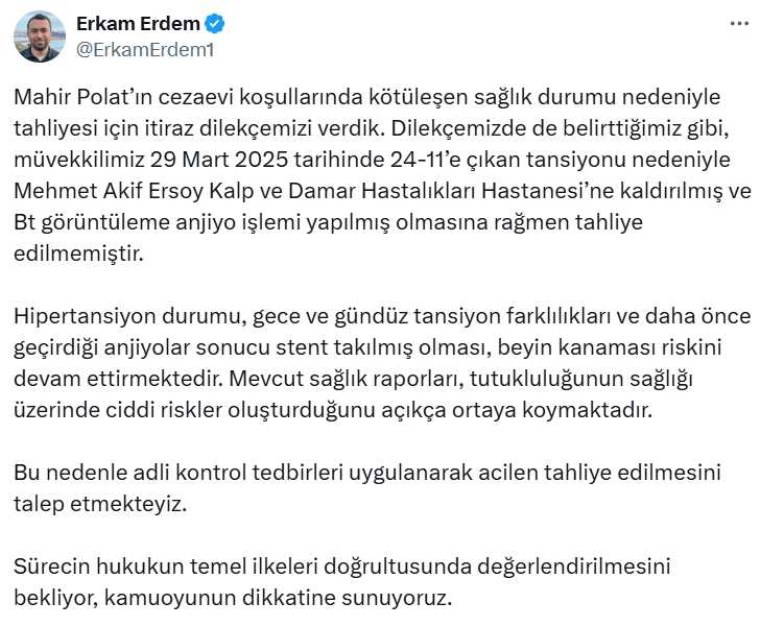 "Müvekkilimiz 29 Mart 2025 tarihinde 24-11’e çıkan tansiyonu nedeniyle Mehmet Akif Ersoy Kalp ve Damar Hastalıkları Hastanesi’ne kaldırılmış ve Bt görüntüleme anjiyo işlemi yapılmış olmasına rağmen tahliye edilmemiştir" diyen avukat Erkam Erdem, Mahir Polat hakkında şu ifadeleri kaydetti:
