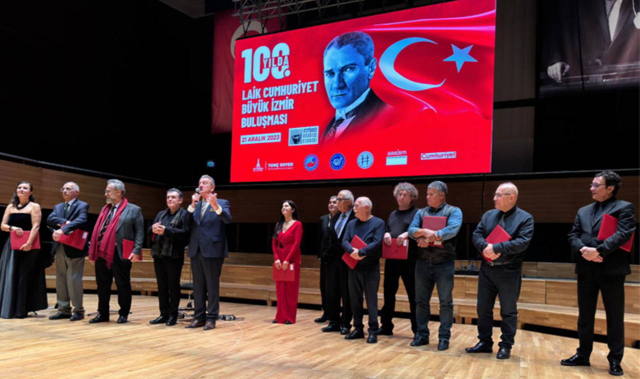 Atatürk, Cumhuriyet ve laiklik savunucuları İzmir’den gerici karanlığa karşı bir kez daha aydınlık çağrısı yaparken, Atatürk ve devrimlerine sahip çıkılacağı belirtildi. Atatürkçü Düşünce Derneği (ADD), Birleşik Kamu-İş, Çağdaş Yaşamı Destekleme Derneği (ÇYDD), Sanatçılar Birliği ve gazetemiz Cumhuriyet’in düzenlediği “100. Yılda Laik Cumhuriyet Büyük Buluşması”nın üçüncüsü İzmir Büyükşehir Belediyesi’nin ev sahipliğinde yapıldı.