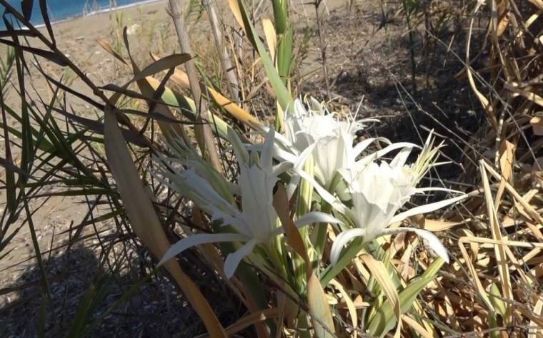 Dünyada nesli tükenme tehlikesi ile karşı karşıya olduğu bildirilen, koparılması ve yurtdışına götürülmesi yasak olan endemik bitki türü kum zambakları Yeşilöz Sahili’ni süslemeye başladı.