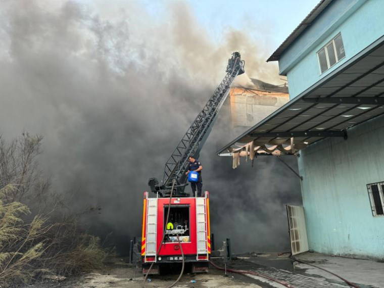 Rüzgarın da etkisiyle hızla büyüyen yangın, Aydın Astim Organize Sanayi Bölgesi'ndeki bir depoya sıçradı.