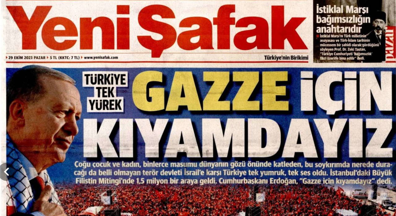 Gerici Yeni Akit manşetinde AKP’li Cumhurbaşkanı Recep Tayyip Erdoğan’ın Filistin mitingine yer verirken, Yeni Asya gazetesinin ilk sayfasında ise Atatürk düşmanı Said Nursi var.