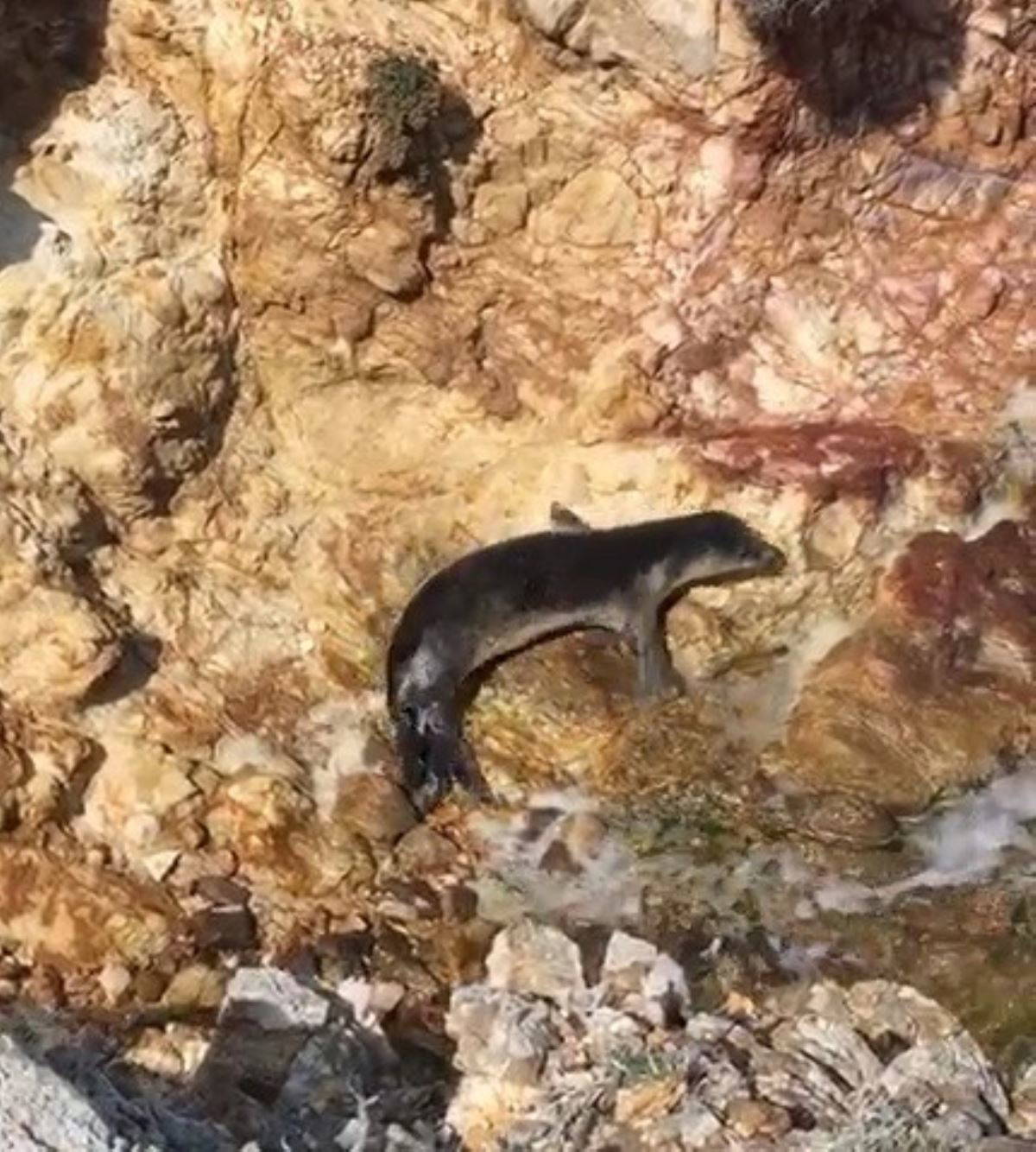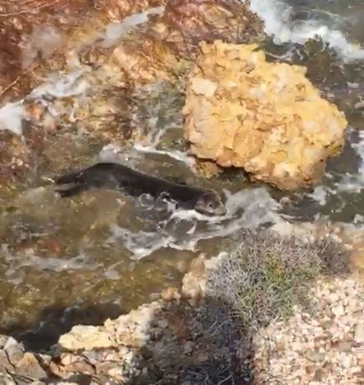 Ayvalık’ın 22 adasından biri olan Tavuk Adası’nda kayalıkların arasında güneşlenip, uyurken balıkçılar tarafından görüntülenen fok balığı, görüntülendiğini fark edince denize atlayarak gözlerden kayboldu.