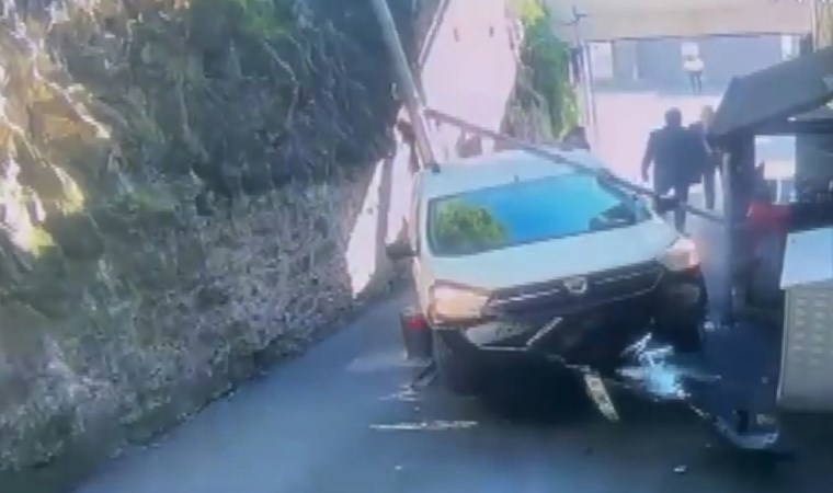 Aracın dubaların üstünde asılı kalmasının ardından aracından inen şüphelinin güvenlik görevlilerinin üstüne yürüdüğü görülüyor.