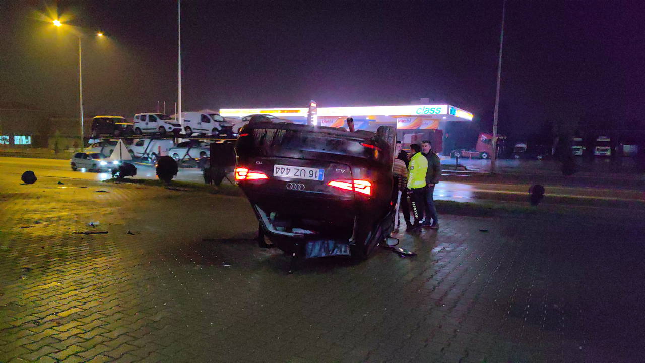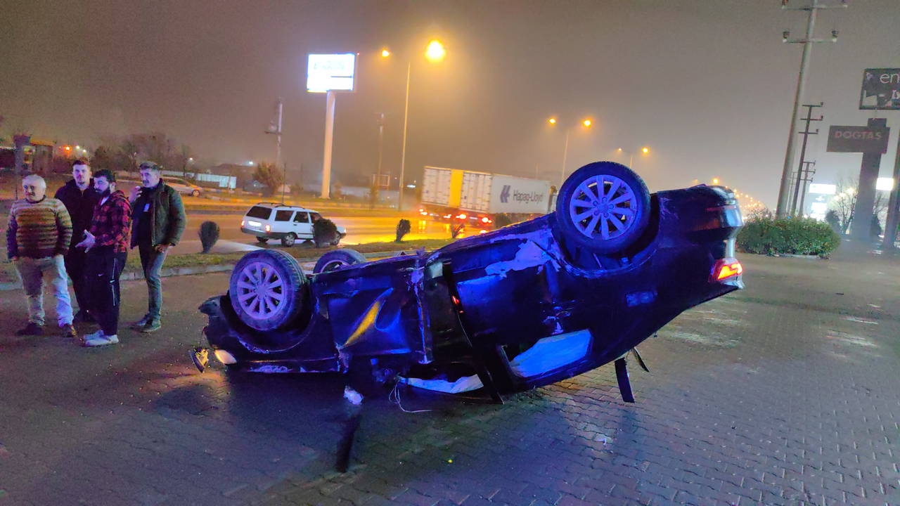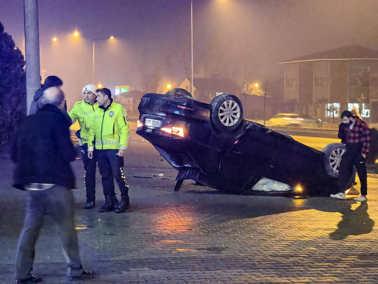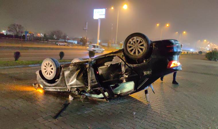 Yağış nedeniyle kayganlaşan yolda sürücünün direksiyon hakimiyetini kaybettiği otomobil kaldırıma çarptıktan sonra taklalar atarak ters durdu.