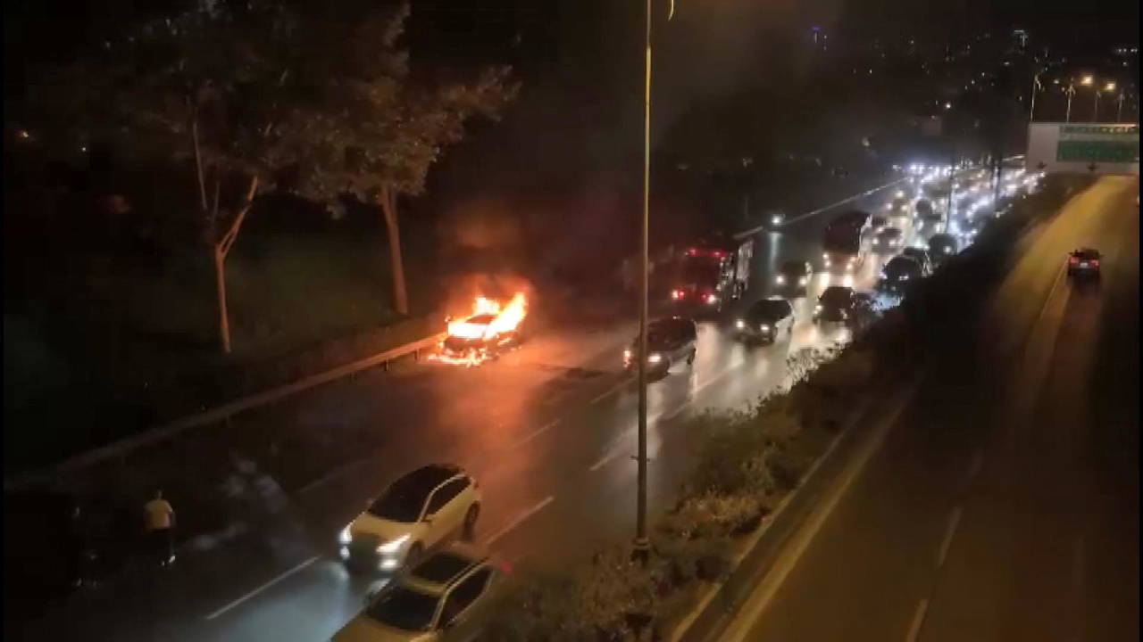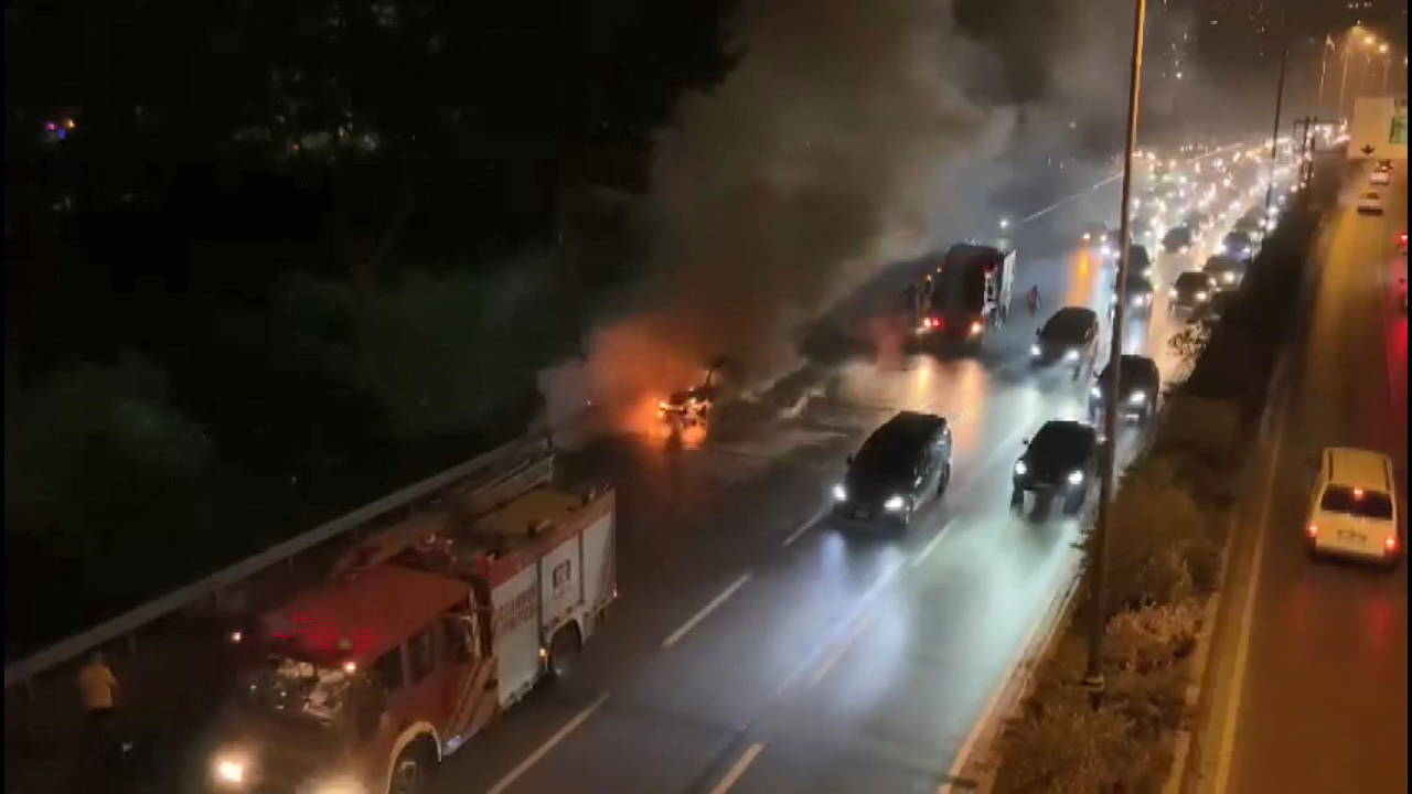 Bağcılar, TEM Otoyolu'nda cumartesi gecesi, bir otomobilde bilinmeyen nedenle yangın çıktı. Sürücü otomobili yol kenarına çekerek aracı terk etti.