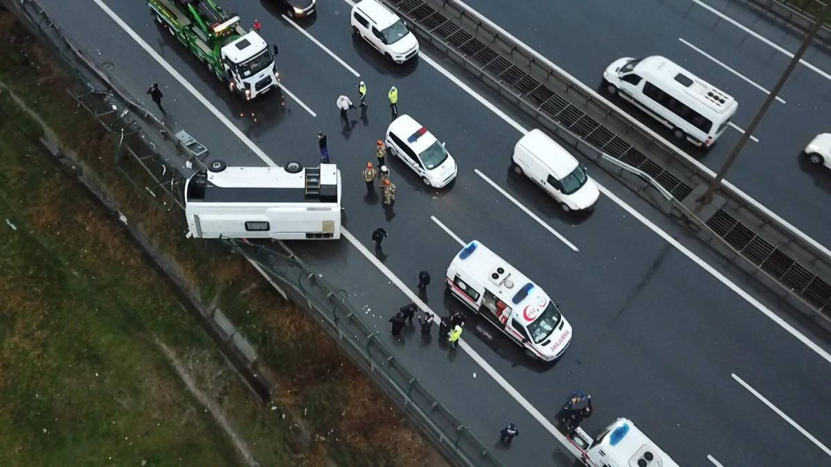 Edirne'den Metris Cezaevi'ne dönen jandarmaya ait midibüs kaza yaptı. Bariyerlere çarparak devrilen midibüsün yarısı bariyerler üzerinde kaldı.
