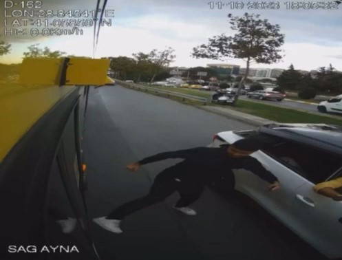 O sırada otobüsün içerisindeki yolcular yaşananları korkuyla izlerken, İETT şoförü yolculara "Ben araç kullanırken telefonla konuşamıyorum, polisi arayıp plakalarının fotoğraflarını çeker misiniz" dedi.