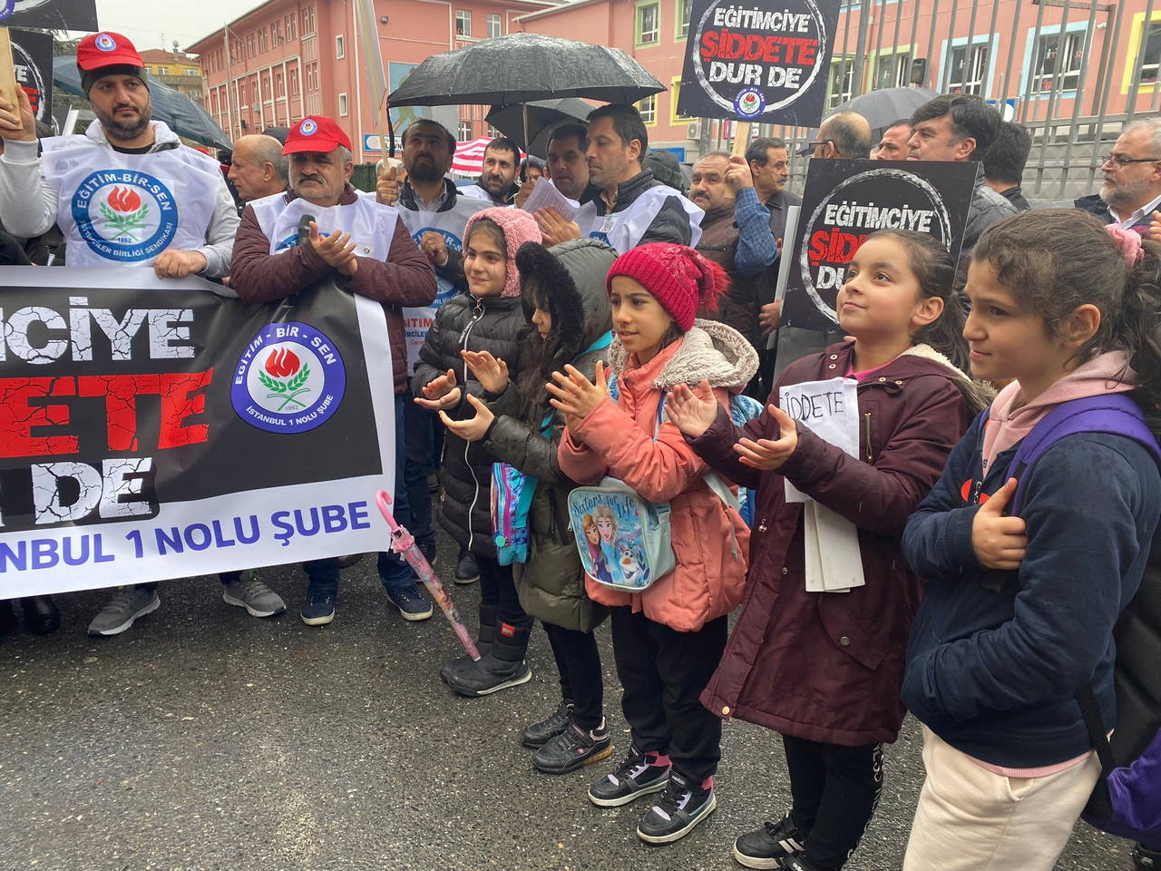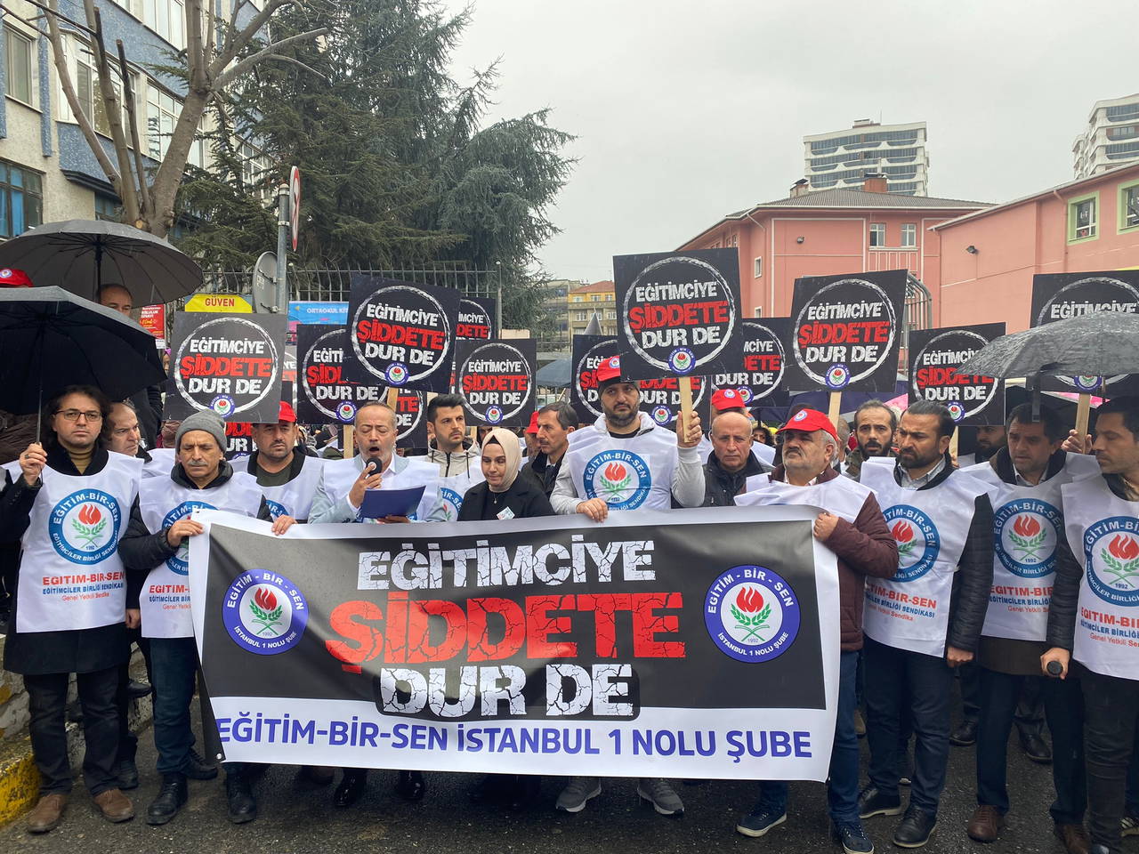 Eğitim Bir-Sen üyeleri ise okul önünde toplanarak 'Öğretmene şiddete hayır' eylemi yaptı.