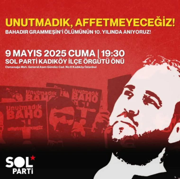 Bahadır Grammeşin'i ölümünün 10. yılında anmak üzere 9 Mayıs Cuma günü saat 19.30'da Sol Parti Kadıköy İlçe Örgütü önünde buluşuyoruz.''