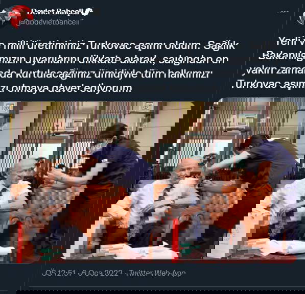 MHP Genel Başkanı Devlet Bahçeli de, makamında Turkovac aşısı yaptırdı. Bahçeli, aşı olurken çekilen fotoğrafları Twitter'daki hesabından paylaşarak, "Yerli ve milli üretimimiz Turkovac aşımı oldum. Sağlık Bakanlığımızın uyarılarını dikkate alarak, salgından en yakın zamanda kurtulacağımız ümidiyle tüm halkımızı Turkovac aşımızı olmaya davet ediyorum" dedi.