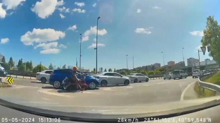 Görüntülerde motosikletin sağ şeritte ilerlediği, şerit değiştirmek isteyen otomobilin motosiklete çarptığı anlar görülüyor. Çarpmanın etkisiyle yere düşen sürücü yan yoldan gelen otomobilin altında kalmaktan son anda kurtuluyor.