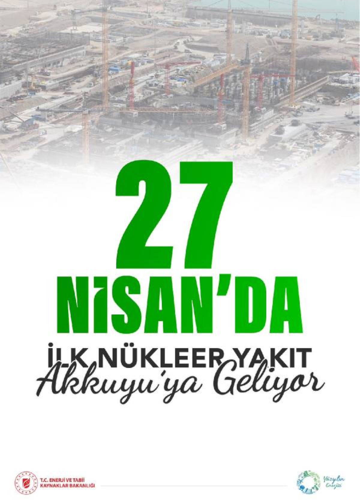 Bakan Fatih Dönmez, Twitter hesabından yaptığı paylaşımda, "Akkuyu'da sona yaklaşıyoruz. 27 Nisan'da ilk nükleer yakıt tesisimize geliyor. Böylece Akkuyu, nükleer tesis statüsü kazanacak" dedi.