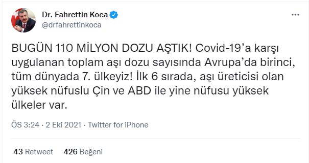 Bakan Koca, Twitter'daki hesabından yaptığı açıklamada, Covid-19'a karşı uygulanan topla aşı sayısında 110 milyon dozu aştıklarını duyurdu. Koca, "Bugün 110 milyon dozu aştık. Covid-19’a karşı uygulanan toplam aşı dozu sayısında Avrupa’da 1'inci, tüm dünyada 7'nci ülkeyiz. İlk 6 sırada, aşı üreticisi olan yüksek nüfuslu Çin ve ABD ile yine nüfusu yüksek ülkeler var" dedi.